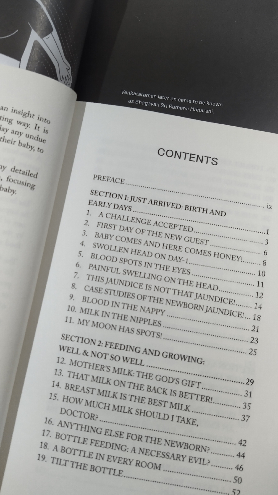 So he has divided the book into 6 sections wherein his aim is to provide the reader with an insight into the new borns wonderful life wherein he bursts myths and lay any undue anxiety in the parent's minds by addressing loads of topics like how early days can be, facts about swollen parts and painful swells on heads, blood spots in eyes, milk in their nipples, cases of early jaundice, how mother's milk is god's blessing, facts about bottle feeding, formula feeding, fever, vomiting, Diarrhoea, coughing, foul smell, cradle crap, harnia, fungus in mouth, diaper rashes, oil massages, teething, and many such topics that will help parents who are readers to understand do's and dont's in the process.